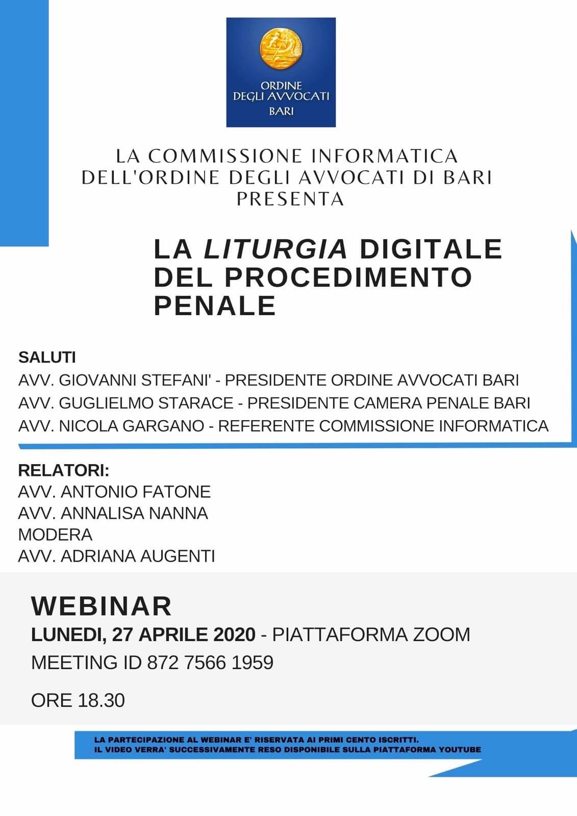 WEBINAIR – LA LITURGIA DIGITALE DEL PROCEDIMENTO PENALE – 27 APRILE 2020