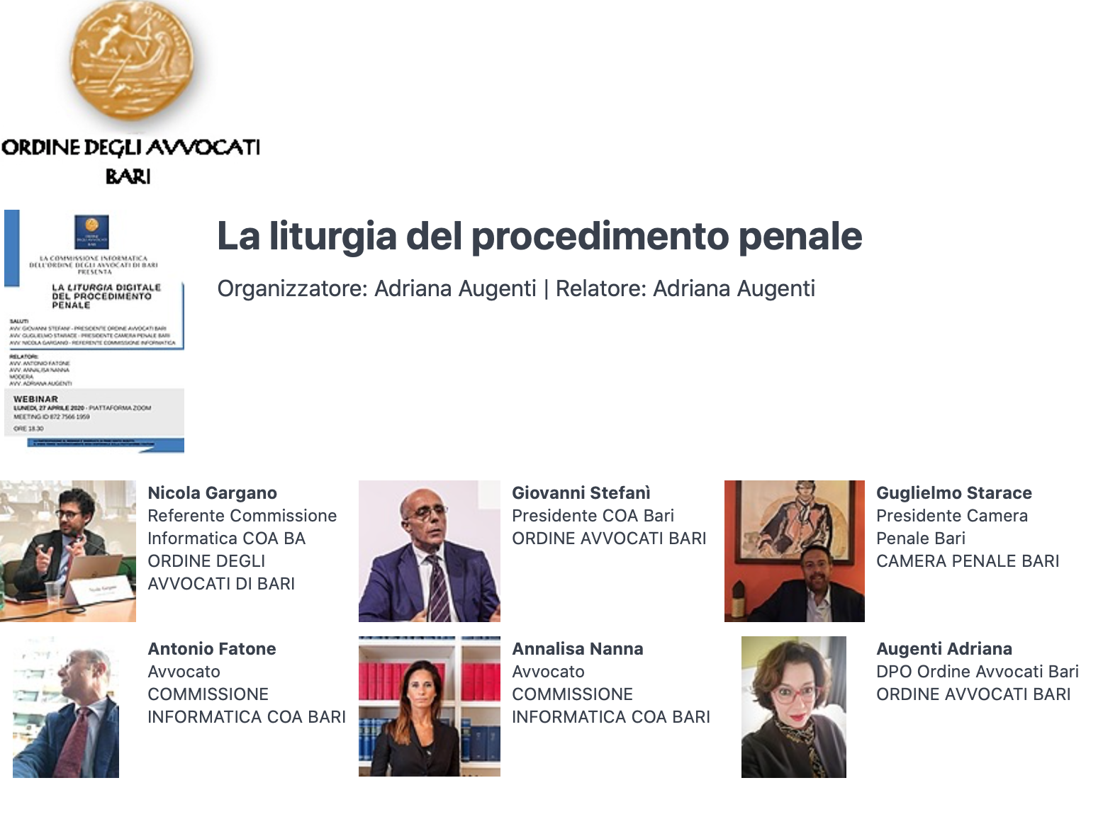 In periodo di emergenza pandemica, una analisi pratica (Avv. Annalisa Nanna) e normativa (Avv. Antonio Fatone) dei collegamenti da remoto attuati per le attività d’udienza celebrate tra il 9 marzo ed il 30 giugno 2020. Moderatrice – avv. Adriana Augenti. Con l’intervento del Presidente dell’Ordine degli avvocati di Bari, avv. Giovanni Stefanì, e del Presidente della Camera Penale di Bari, avv. Guglielmo Starace. Su piattaforma Zoom e GoToWebinar.
